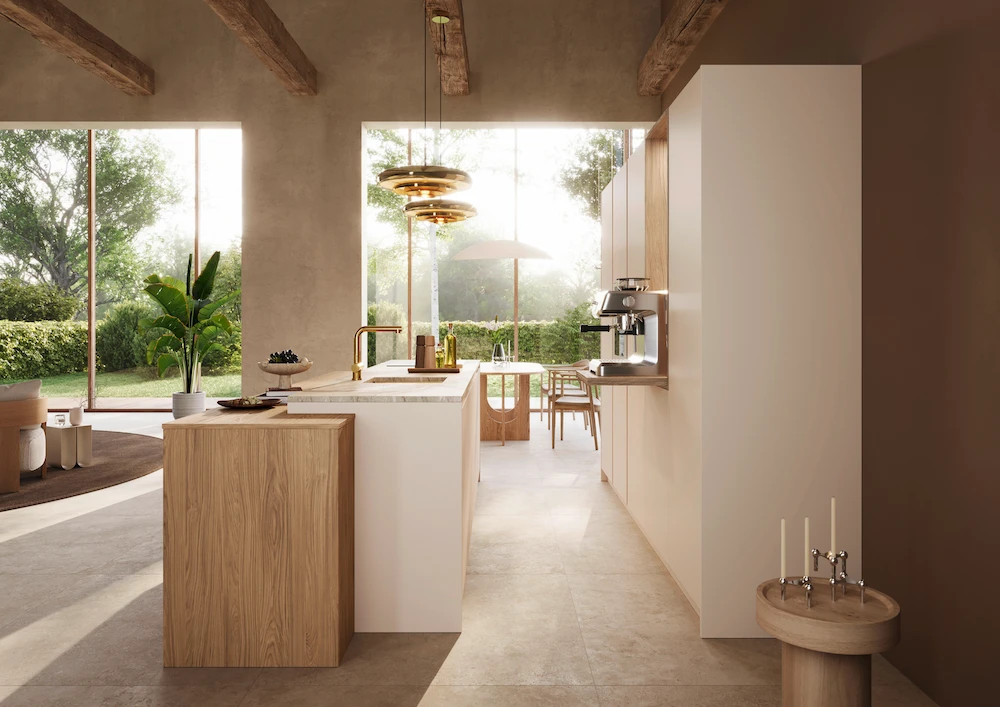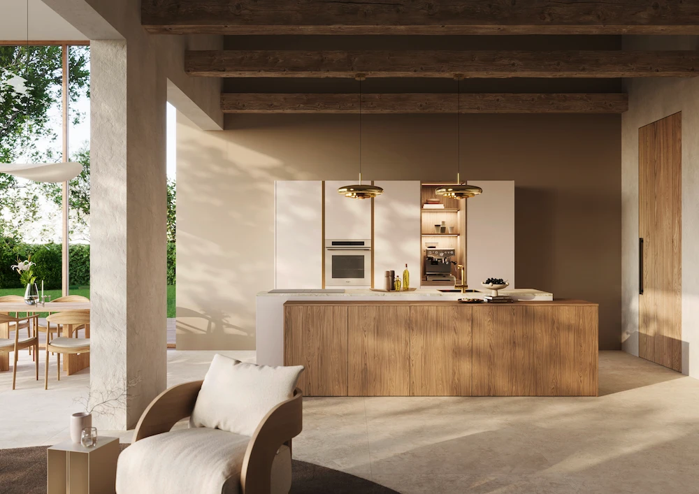 Quality materials in wood, metal, and glass become the go-to for emphasising tone and texture in naturally styled interiors… Deemed the top interior style for the kitchen living space in 2026, rustic minimalism combines the warmth of natural materials with the simplicity of minimalist design. Also satisfying the rising demand for stealth wealthinteriors, rustic minimalism focuses on quality over quantity to achieve an understated look, which focuses on the unique features and visual characteristics of different materials. Whether light or dark, different species of oak and walnut will dominate the modern kitchen space in 2026. Available in a range of styles and formats, the latest wooden kitchens include hero products like island units, sideboards, or a bank of appliances; wood accents seen across the shelving, wall niches, trims, plinths, cupboard interiors, and storage drawers; and the latest technique called wood drenching, where you opt for an all-wood scheme to create a fully immersive kitchen living environment. Special surface solutions are also being used for their aesthetic appeal with metal accents in brass, copper, and steel, smoked glass, and super matt door fronts helping to emphasise tone and texture. Dominant colours include near-neutral shades in beige, white, black, and grey, alongside earthy yellow pigments that resemble baked clay for a natural pop of colour.