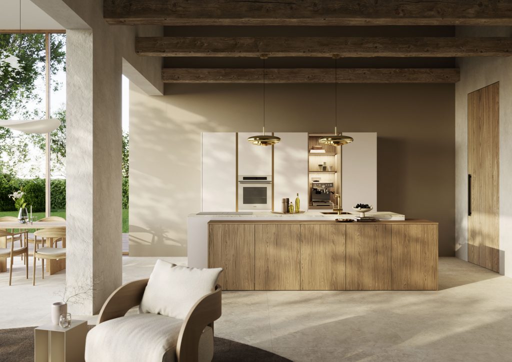 Quality materials in wood, metal, and glass become the go-to for emphasising tone and texture in naturally styled interiors… Deemed the top interior style for the kitchen living space in 2026, rustic minimalism combines the warmth of natural materials with the simplicity of minimalist design. Also satisfying the rising demand for stealth wealth interiors, rustic minimalism focuses on quality over quantity to achieve an understated look, which focuses on the unique features and visual characteristics of different materials. Whether light or dark, different species of oak and walnut will dominate the modern kitchen space in 2026. Available in a range of styles and formats, the latest wooden kitchens include hero products like island units, sideboards, or a bank of appliances; wood accents seen across the shelving, wall niches, trims, plinths, cupboard interiors, and storage drawers; and the latest technique called wood drenching, where you opt for an all-wood scheme to create a fully immersive kitchen living environment. Special surface solutions are also being used for their aesthetic appeal with metal accents in brass, copper, and steel, smoked glass, and super matt door fronts helping to emphasise tone and texture. Dominant colours include near-neutral shades in beige, white, black, and grey, alongside earthy yellow pigments that resemble baked clay for a natural pop of colour.