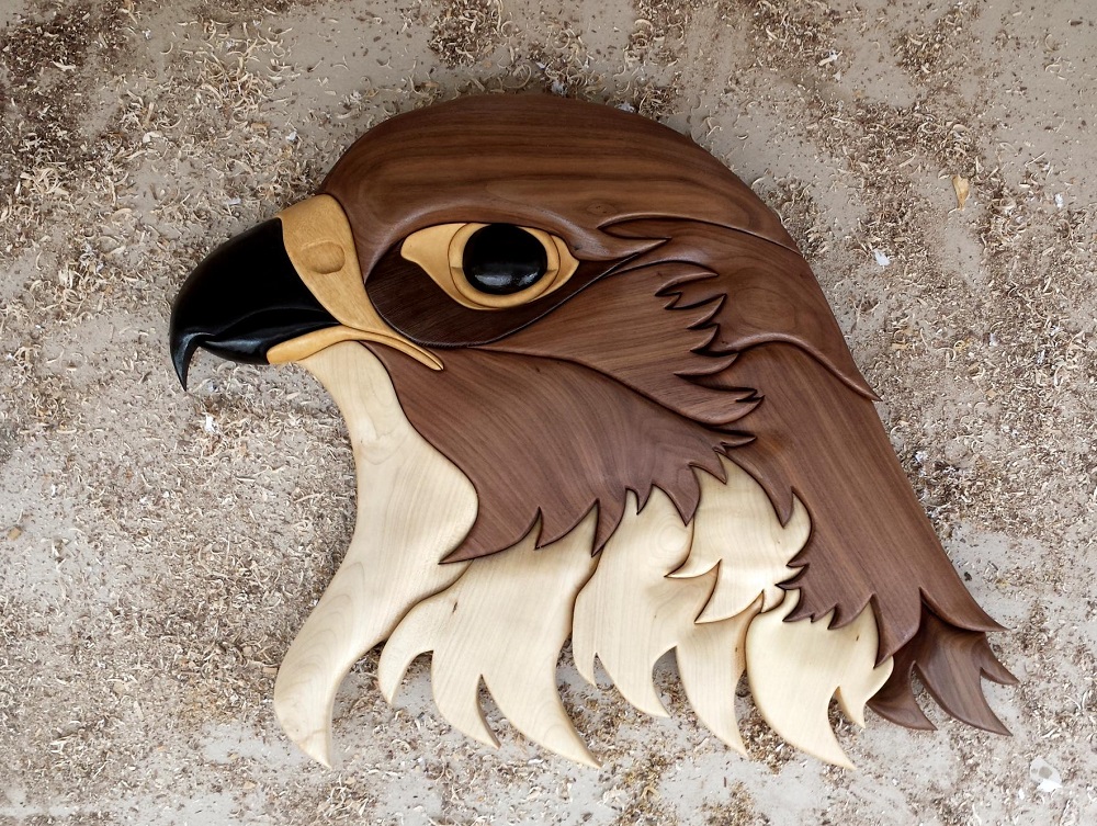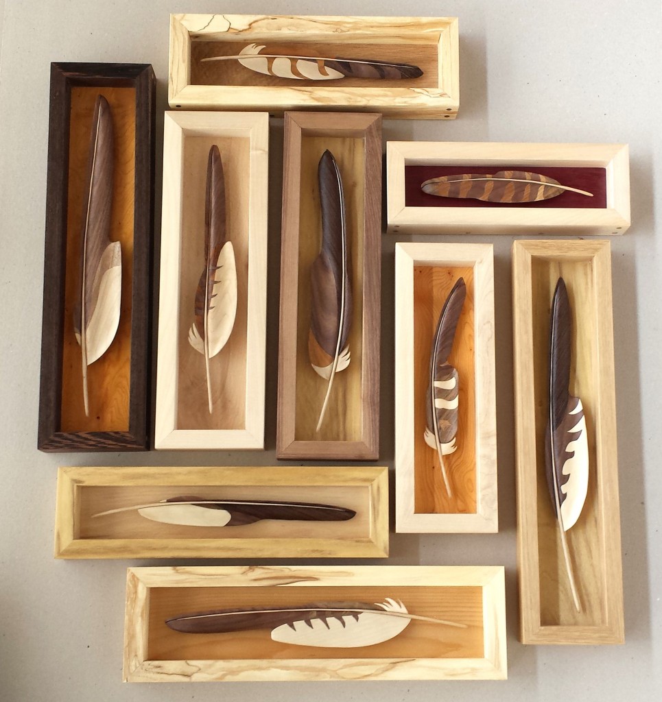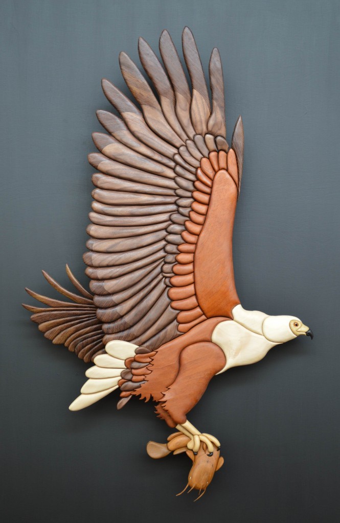 Tom’s passion for birds of prey is often the driving force behind his work, which allows him to recreate the shape and form of any bird. His sculptures of birds of prey in flight are very dynamic, which gives you a feeling of the grace and power possessed by real birds. Tom has also developed the intarsia technique further to enable him to accurately reproduce feathers with their delicate structure and flowing contours.