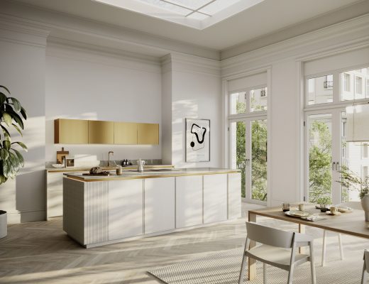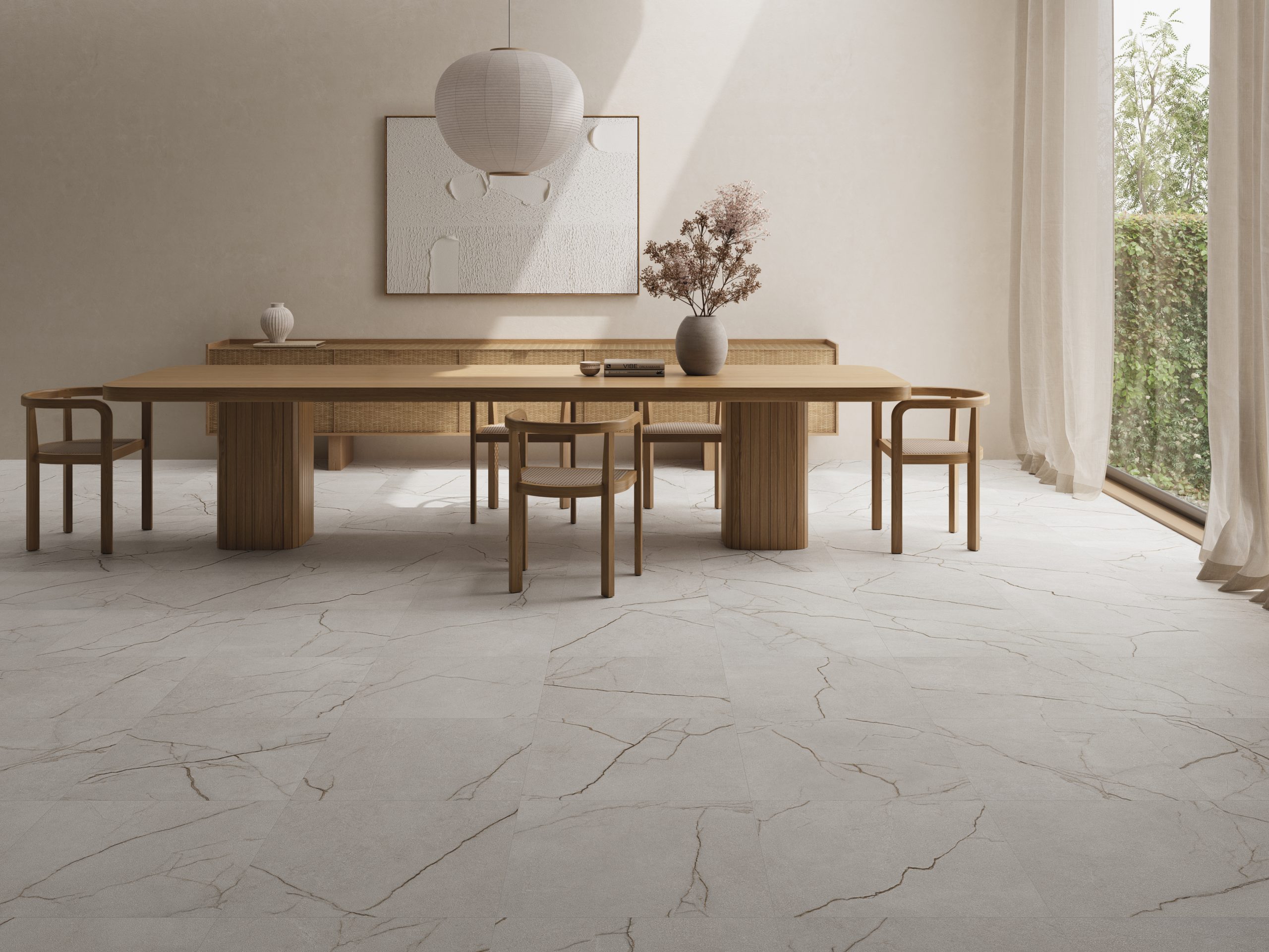 Raffaello: matter as balance. In the kitchen clad with Raffaello, both on the floor and part of the wall, the ceramic integrates with wood and concrete in a restrained composition. The ivory tones of Avorio di Segesta marble translate into a warm and uniform surface, where the golden veining appears as a subtle trace. The result is a balanced and luminous atmosphere, ideal for projects seeking calm and continuity. In the dining room, the barely visible texture of the material becomes a neutral backdrop.