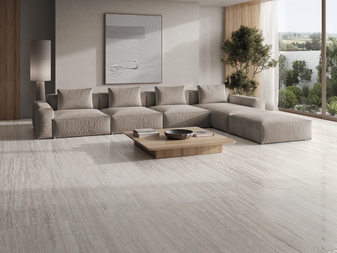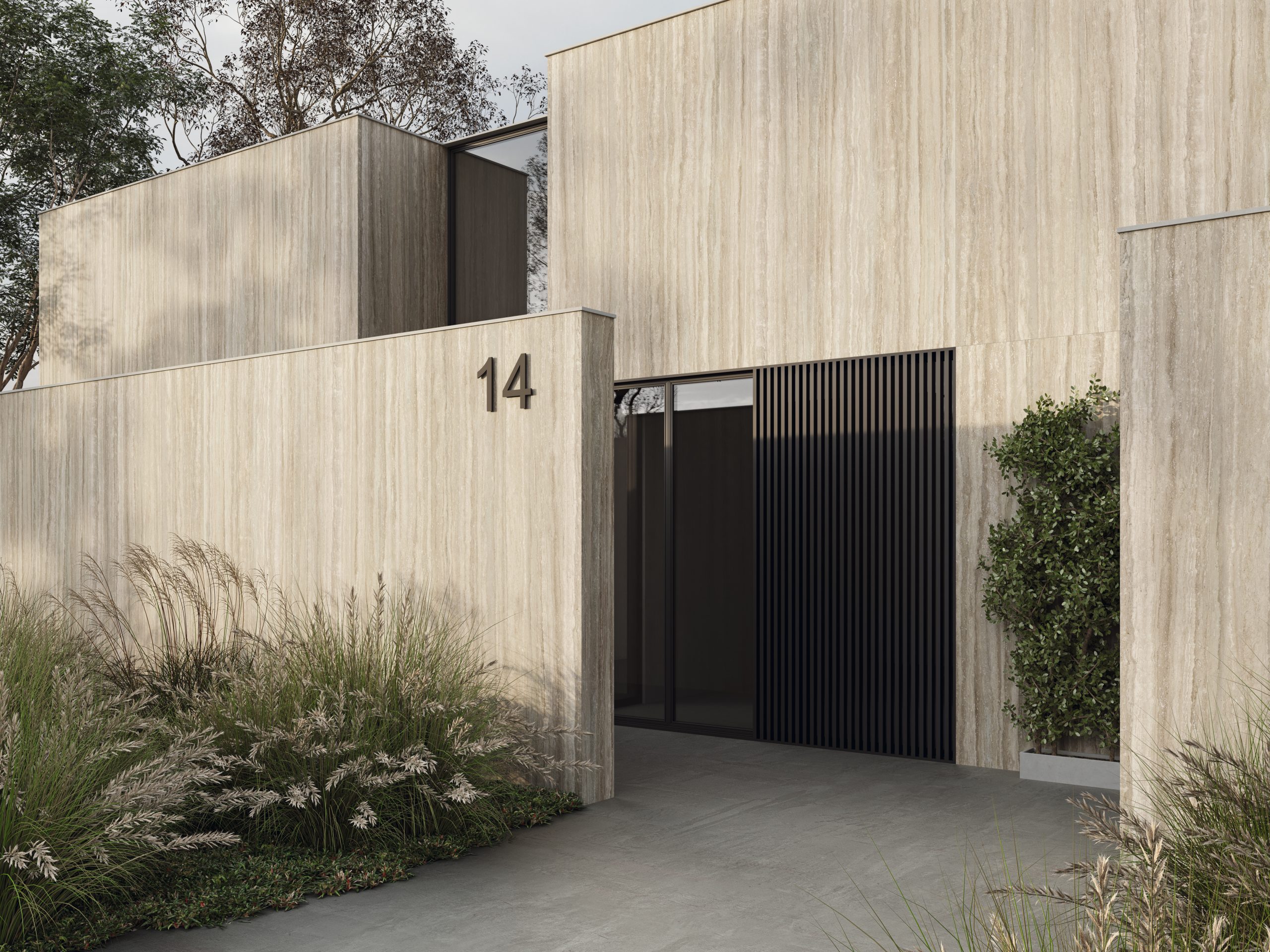 In the image, the volumes of a house appear carved from a single block of stone. Flavia’s surface clads the façade with a travertine reinterpretation in ceramic form, where the vertical veining becomes a constructive rhythm. The precision of the joints and the continuity of the pattern allow the building to be read as an orderly sequence of coherent and sober planes. The sand tone and linear texture add a sense of naturalness. When light falls on the façade, it creates a play of delicate shadows that modulate the surface and give depth to the composition.