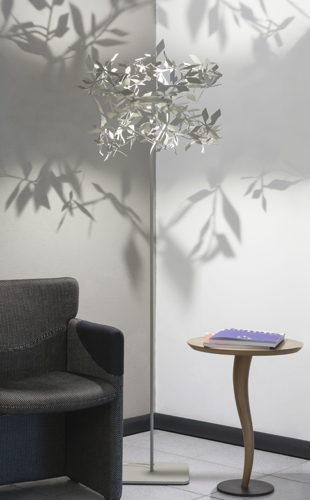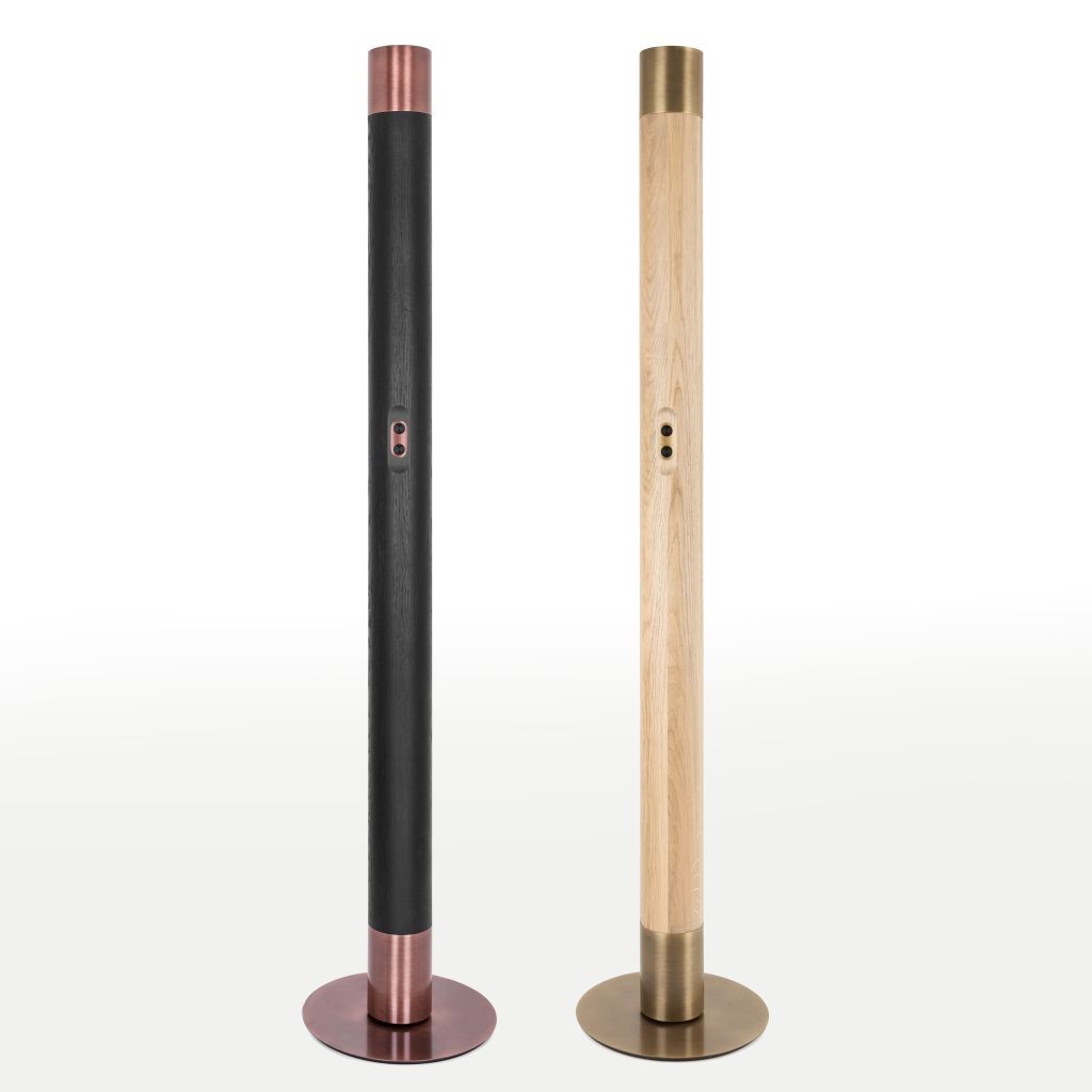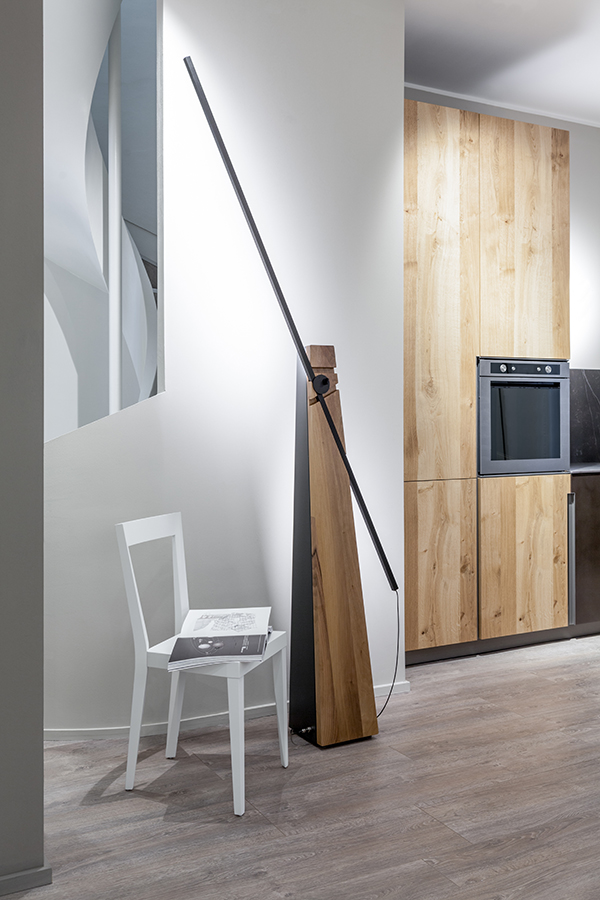 Floor lamp with double LED light sources, Solid oak or walnut base with a black anodized arm housing the LED light source. Three machined grooves in the main body allow the light source to be placed in up 12 positions, with a further set of LEDs in the back of the main body.  The dimmable LED light sources are perfect for creating indirect and direct mood lighting