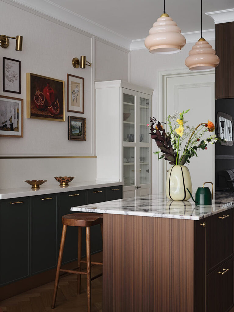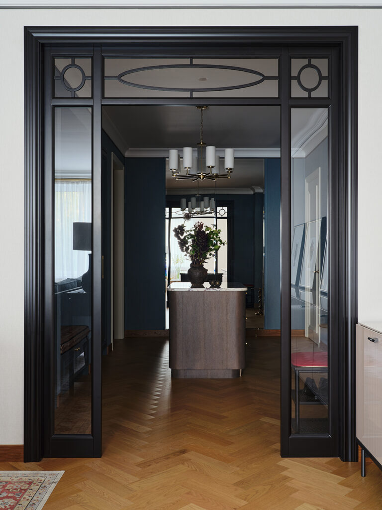 The result is an interior with character — a European eclecticism, where classical proportions coexist with modern forms, and rich colors and noble materials create an atmosphere of intelligent luxury and home comfort.