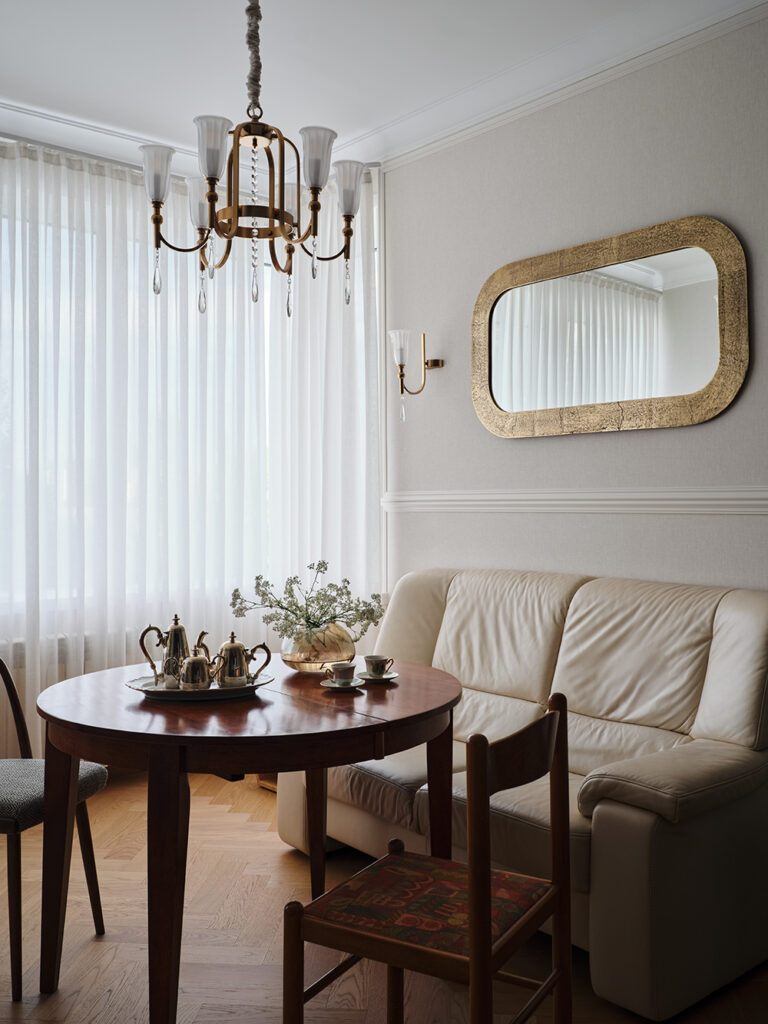 Most of the furniture was moved from the previous apartment: a sea-green sofa, Italian furniture for the TV area, an antique round table, a leather kitchen sofa, display cases for porcelain, and other items.
