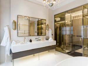 The master suite spans the entire second floor and features a stunning bespoke bed with furniture by Koket and Baker and lighting by Gladee, Tyson and Porta Romana. The dressing room is impeccably detailed with glass display cabinets and Murano glass lighting, while the connected bathroom has a stunning onyx wall with inset metal details and a steam shower.