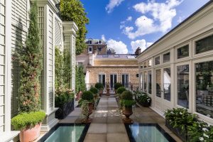 The main house is 23,000 sq. ft and comprises six floors, consisting of the formal reception areas, dining room and eight bedrooms; a mews house at the back with three bedrooms and living rooms; as well as a lower ground and basement living area and spa, which connects both buildings on several levels throughout the home.