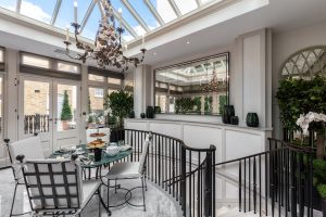 The main house has a stunning original cantilevered stone staircase containing many historic details. This has been sensitively restored and enhanced using hand burnished metallic plaster panelling by Calfe Crimmings and displays an extraordinary four-meter-tall fluted glass chandelier.
