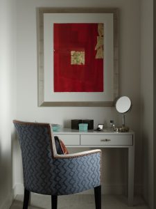 The vision for the design was to create an elegant and comfortable space with luxurious touches and a drinks bar for entertaining. The floor and lighting plan was redesigned to allow more open spaces and more light to fill the flat, as the ceilings were low and the original design left the flat felling dark and claustrophobic. From the moment you enter, we used recessed wall radiators throughout the apartment to ensure a clean and sleek finish. The sitting area is highlighted with rich burgundies and creams, with smoked glass and dark wood accents, while the bedrooms have distinctive pops of colour and pattern – each with bespoke joinery and individual upholstery. Every area throughout has its own theme yet is connected to one another through its beautiful custom-made furniture and running brass and smoked glass theme. It was very important to us that each element in the design followed a subtle continuity.