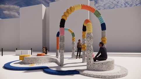 One of the many Design Interventions selected for this year will be on Clerkenwell Green. The Fountain of Technicolour Beads (pictured above), has been created by Hong Kong-based multi-disciplinary studio One Bite Design. This immersive terrazzo installation integrates spatial design with social awareness by focusing on Colour Vision Deficiency (CVD). And next to St James’ Church, The Crinkle-Crankle Bench (pictured above) will take pride of place. This series of half crescent benches crafted from natural stone bricks is designed by architectural practice StudioFolk.