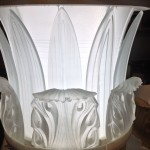 Cast glass capitals – this is a photo of early stages of design development working on a neo classical style of acanthus leaves and palms, with glass parts designed to be built around a light sheet.  Starting with a hand made wax model the cast glass then achieves double bends and locks together with 3D printed footings on the base – I highly challenging and innovative design.