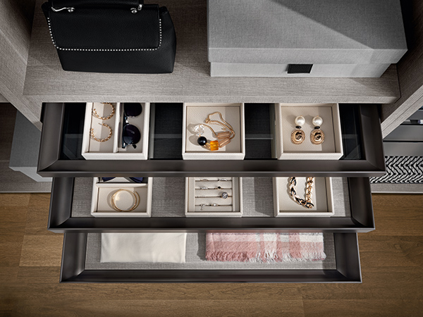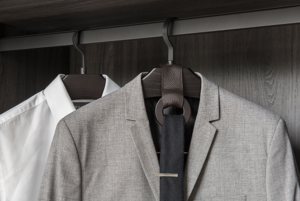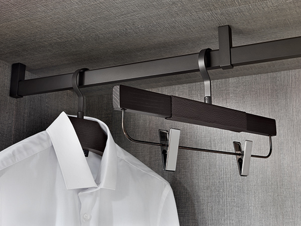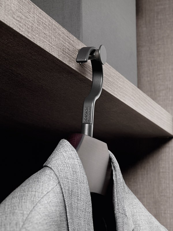 Store, Hang, Protect, Contain, Pull out. Salice opens a new world of elegance and refinement, enriching its existing wide products range with the launch of Excessories, its first collection of accessories with the highest aesthetic-functional qualities. An infinite variety of solutions designed to optimise space and to facilitate the perfect arrangement of wardrobe interior fittings, offering infinite possibilities of exquisite style and convenience. Excessories – Night Collection allows wardrobes and walk-in wardrobes of all styles to accommodate elegant hangers, scarves and tie hangers, bag hangers, cotton garment holder bags, trouser hangers and shoe racks, all elements of singular refinement and efficiency.