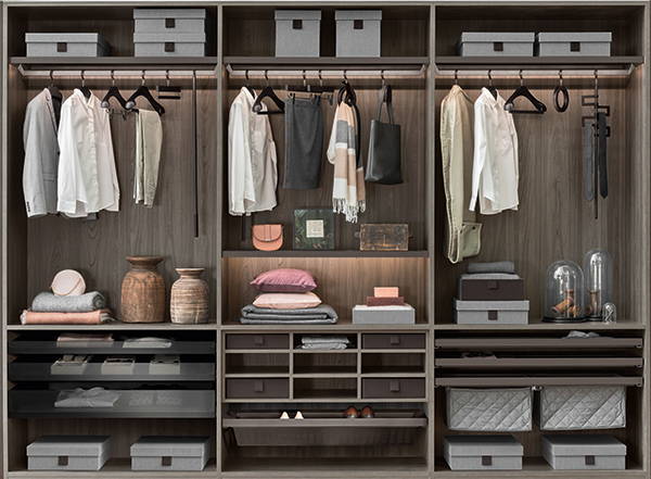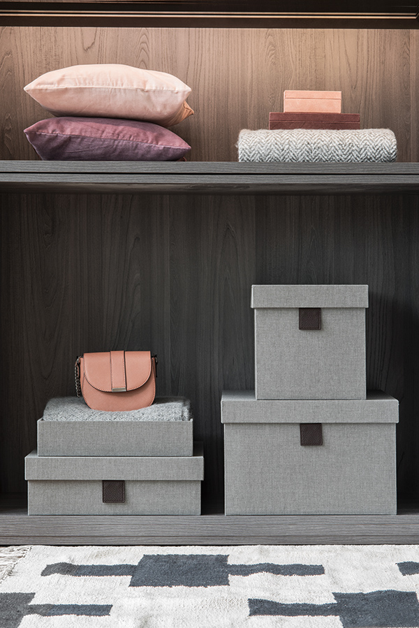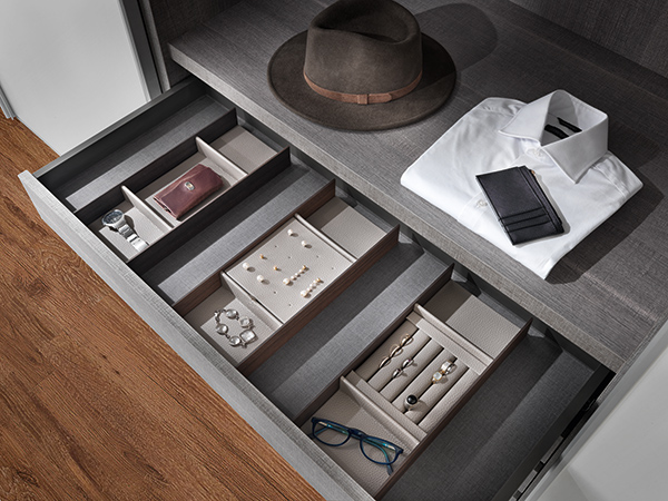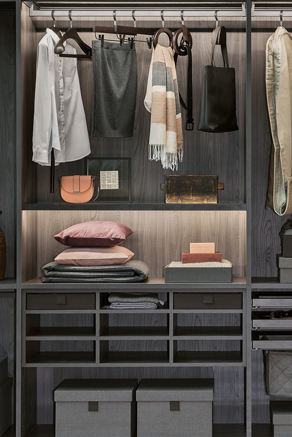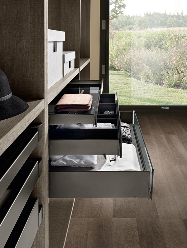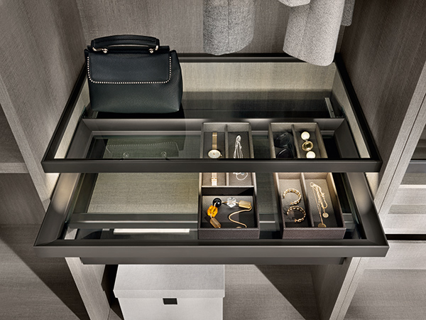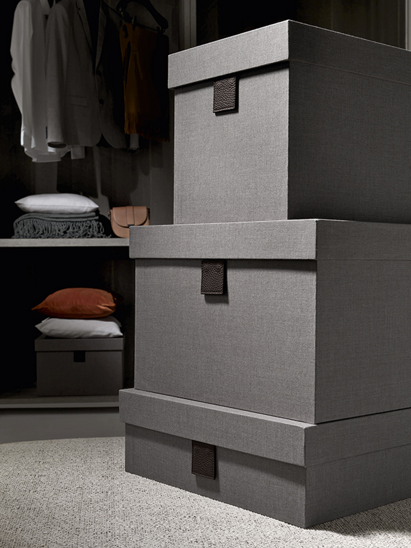 The drawers, with soft shapes and high design, and the illuminated shelves transform the walk-in wardrobe into an inspirational space and make it the most appreciated and coveted place in the home. The materials of the collection, from fabrics to leather and imitation leather, breathe life to endless combinations.