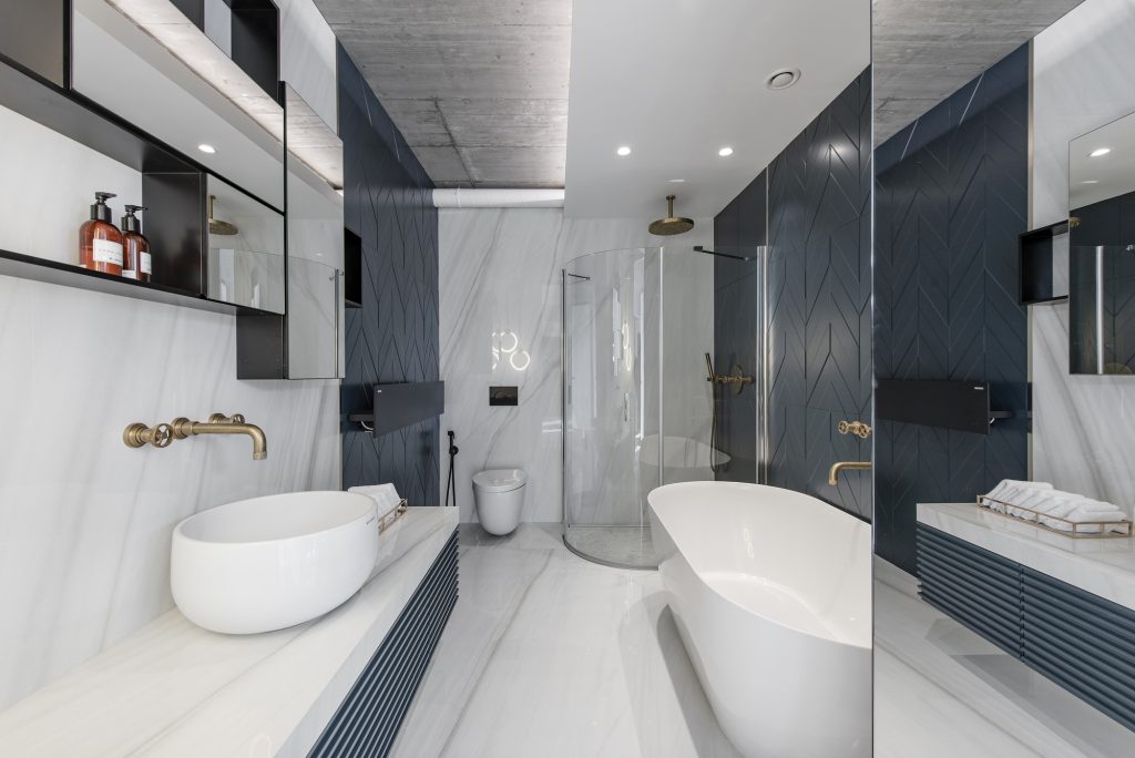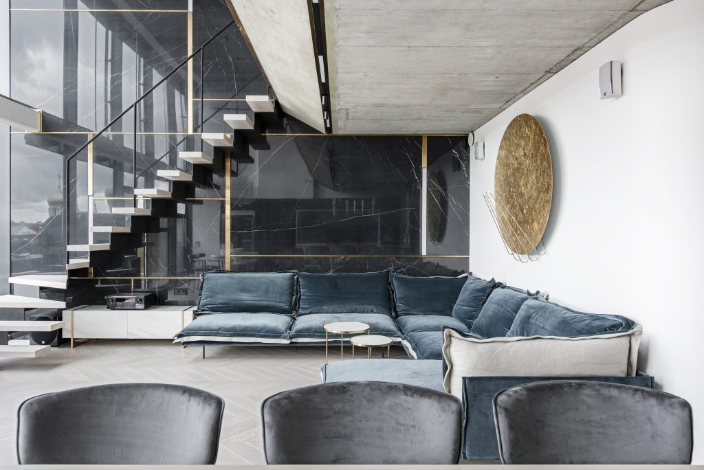 The double-decker’s eyes are large windows that offer panoramic city views. The four-person family here wanted a funky, luxuriously flavored home. The interior of the luxury sense is caused by subtle brass details. The choice of this metal was inspired by the bronze roofs visible through the windows. All-day sunbathing into the apartment allows the bronze surfaces to sound different colors and create a different mood each time. The large, black stone panels that cover the wall contrast with the brass and help it even more reveal.