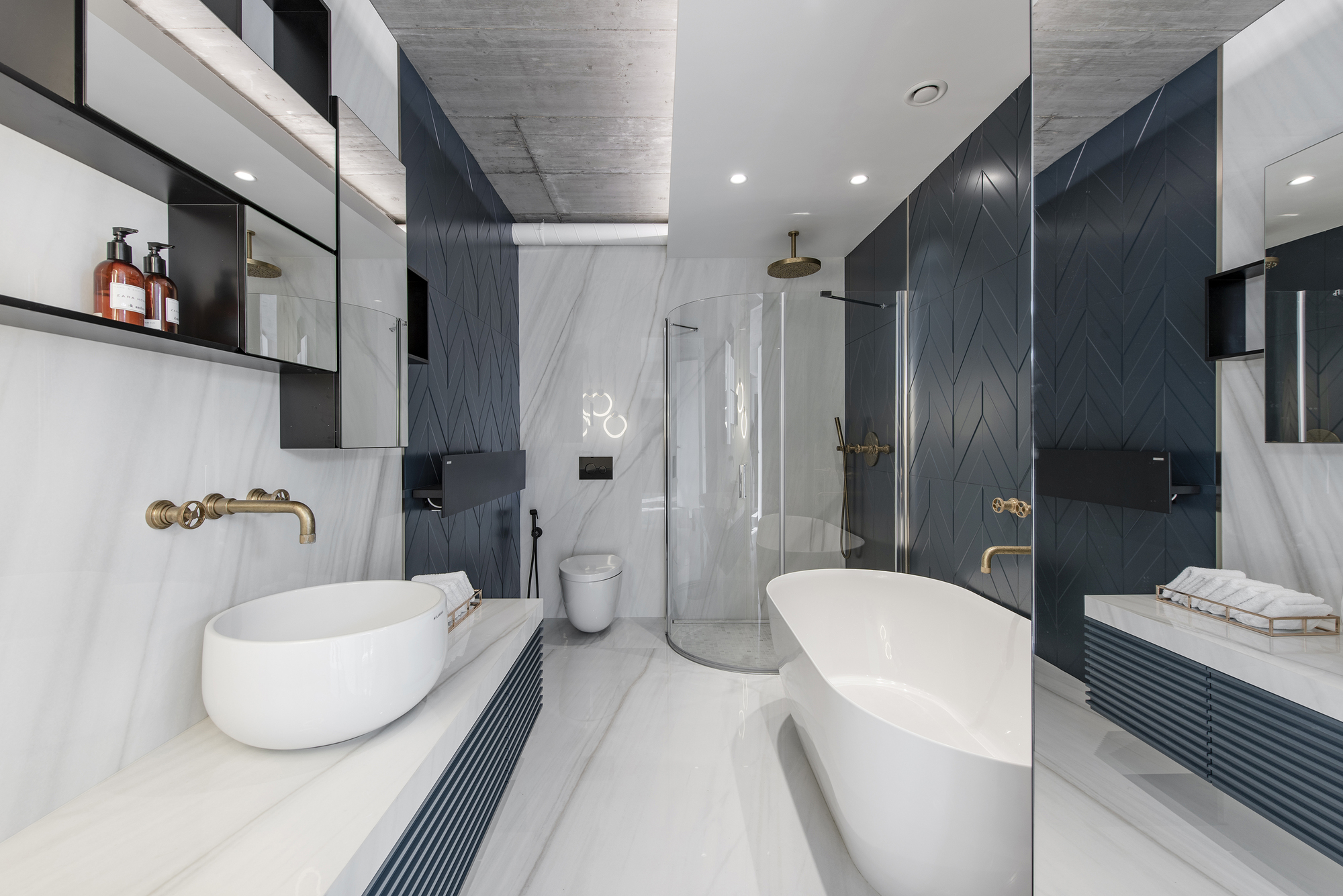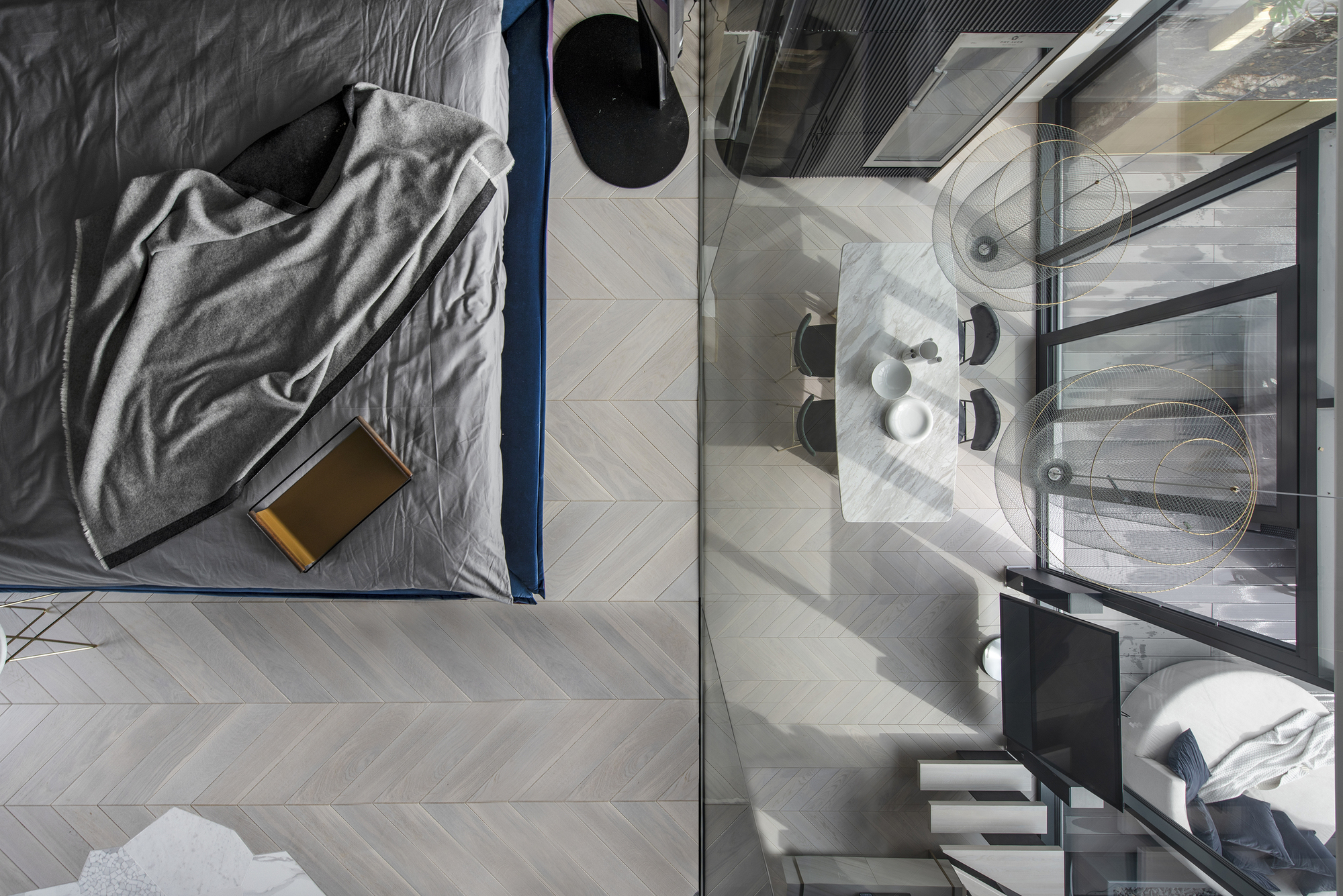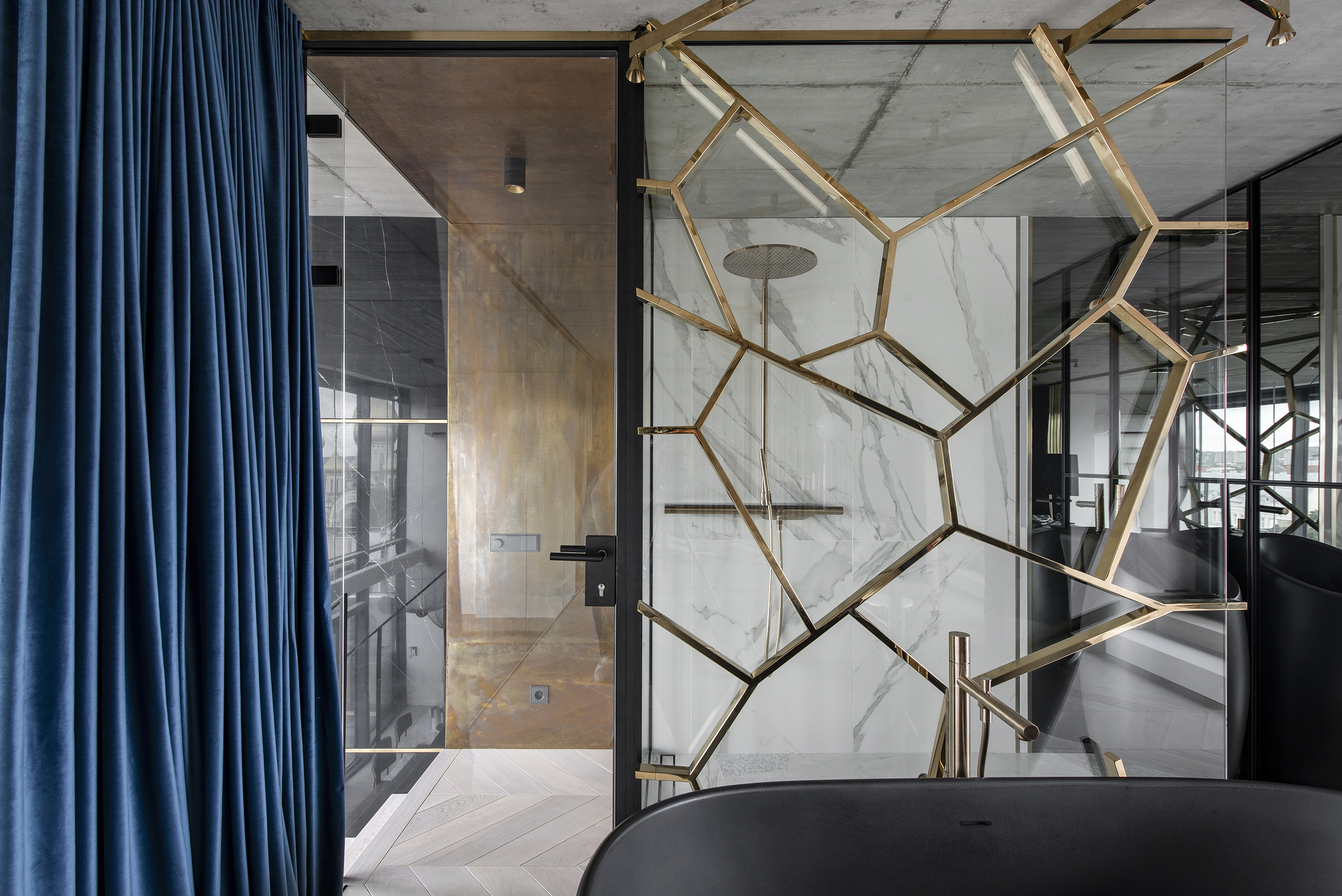 To prevent the site from changing, the edge of its overlay is completed with a sloping edge – thus it more easily fits into the space. In the high-rise, the parent’s bedroom overlooks the city with windows overlooking to the city. Underneath the dining table, elegant, openwork thin-wall luminaires were chosen specially to avoid falling out of this view. The brass luminaire is lighted by the ceiling and the motifs of its shape are reciprocated in the glass partition of the shower next to it. From the bedroom you can access the terrace, which has a small sauna, jacuzzi.