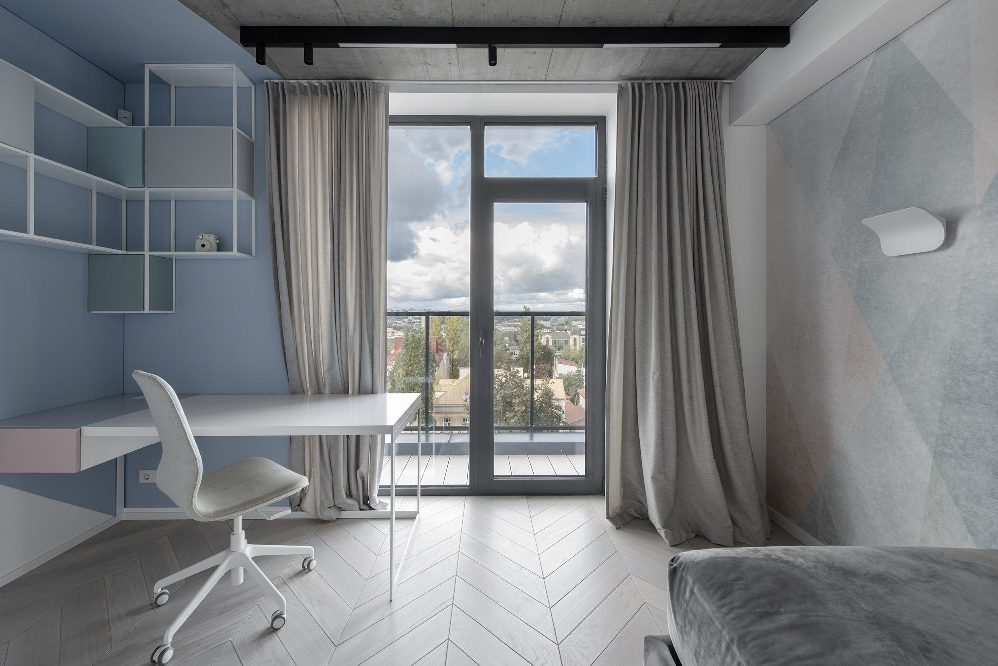 And these natural materials accentuate make it possible to neutralize the combination of concrete ceilings and light, almost white, wood flooring. The interior is engraved with one more color – a solid blue. This colorful velvet sofa is inviting in the living room, and blue in the bathroom, in the bedroom, in the details. The attic in the house is accompanied by white, elegant stairs.