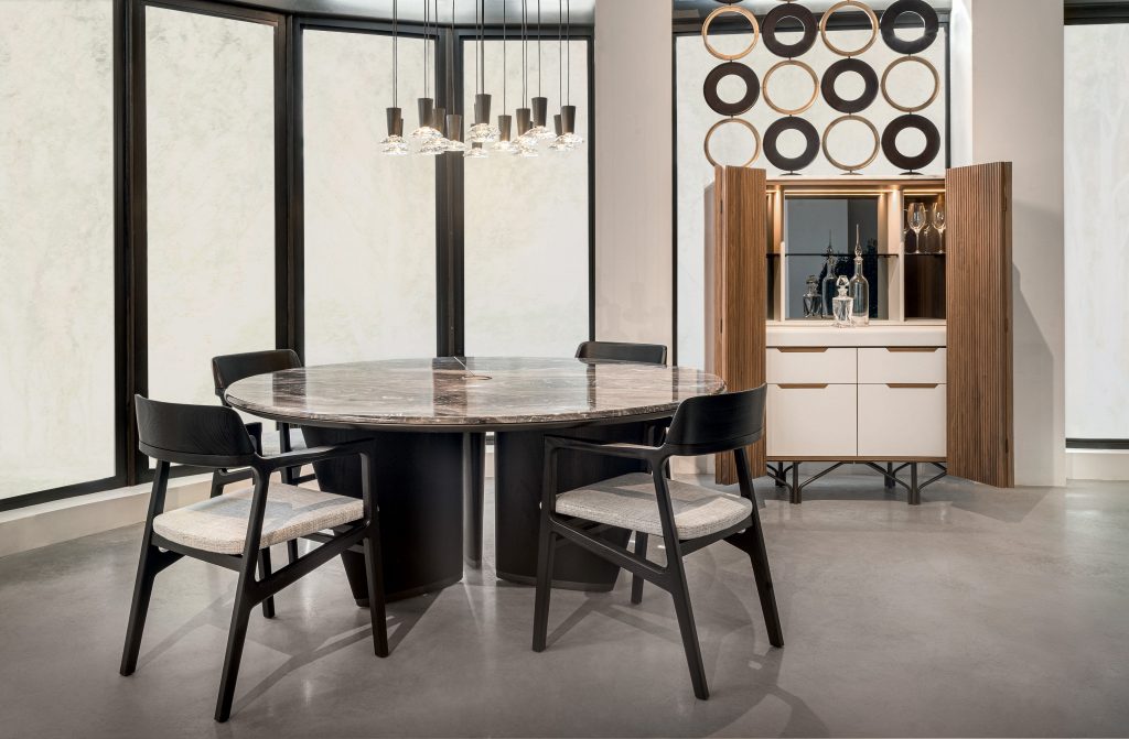 Upon entering, visitors are welcomed into an elegant dining area where the MIZAR table interacts with the NORAH chairs, beneath the sculptural light of the SWORDS chandelier. Just beyond, another convivial setting takes shape around the BIGWIG table, surrounded by AURA chairs and illuminated by the SLIVER chandelier.