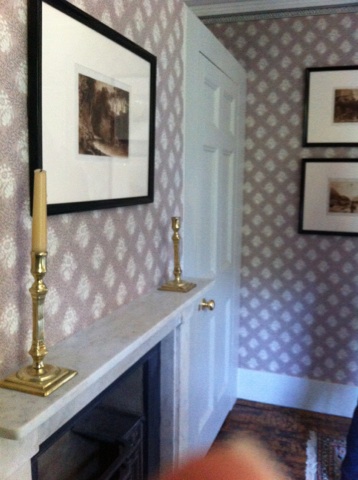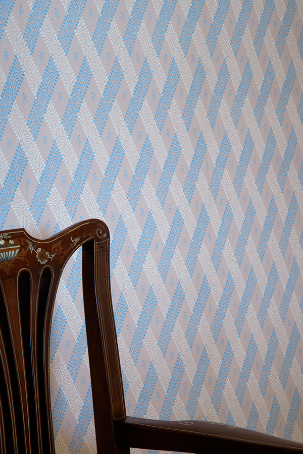 Recent projects have included three hand printed designs for the Jane Austen House Museum in Chawton Hampshire.   Wallpaper was expensive and heavily taxed during the Georgian period.  Early 19th century fragments, still visible inside window shutter boxes, were sufficient to enable reproduction of the design which once again  decorates the Austen Family Room.  The Family were poor when moving to Chawton, and we believe the purchased design, now called Apprentice Trellis, was misprinted, probably by an apprentice, as the printing blocks were originally incorrectly aligned, and the printing less expensive !