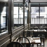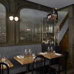 The process began by the chef’s decision to conserve the existing name, but with a slight meaningful adjustment, and to conserve the existing mirrored and molded wood interior. With that as the recipe the interiors of the project became an assemblage of details from the codes of traditional bistros. The details used were: the voilage at the vitrine to provide intimacy from the street and to help forget the day; a velour entry curtain rendered in blue as a reference to the blue of Chicago; globe light fixtures, from Gino Sarfati designed in1965 and found at the Gallery Kreo in Paris; a central ceiling fixture, here treated a plat as if the hanging object had been recessed into the ceiling; the comptoir with a zinc countertop and stained oak skirting, all expressed with a contemporary simplified line that speaks primarily about its form and function; the ardoise for the daily specials; the mirror at the vitrine banquet to see your guest arrive before they see you; the open glass cabinet for digestifs; the oak tables with a modern thin brass pinstripe that prevents the wood edges from wear while also referencing traditional bistro tables with their brass cerclage; the aged oak floor with a brass frame and a resin cement border that is carried through from the kitchen; and the traditional bistro chairs which were found at a brocante in Lille. The only truly contemporary creation is seen in two wall textured inserts placed where two mirrors once sat in former times. Taking cues from aged mirrors but also evoking 18th century pittoresque scenes, these two original works were realized by the decorative painting company Fresco of New York. The color for the wood interior and the graphite and gold rechampie were executed by AC Matières Paris.