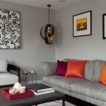 The starting point for the design was the existing dark wood floor throughout and the large lacquered bookshelf in the living room. On top of this I layered furniture and rugs in a palette of warm greys, incorporating a variety of textures to add interest to the scheme. A mix of high street and designer side tables breaks up any uniformity in the design, with the gold finishes adding a touch of sophistication, and the concrete bringing in a playful element. A beautiful, sculptural pendant hangs in one corner of the room, allowing this piece to stand on its own within the design. Finally, to incorporate the bright colours of the client’s Keith Haring artwork, I added splashes of vibrant colour in the curtains and cushions.