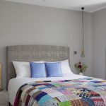 In the bedroom, the design evolved around the bright patchwork quilt that the client owned. To maximise the impact of this piece I chose beautifully textured fabrics for the bed and curtains, and layered these with lacquered bedside cabinets and matching dressing table. Again concrete makes an appearance in this room in the bedside pendants. The bed sits on an Angora shaggy rug which provides an exquisitely luxurious softness underfoot. To reflect the bright colours of the quilt I chose a playful, hand-painted dressing table stool, and finished the scheme with some simply styled Scandinavian mirrors.