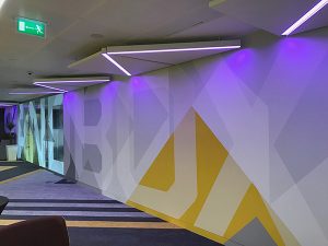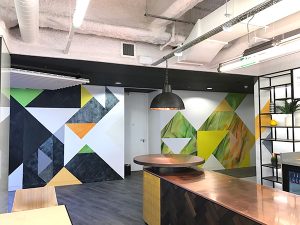 Soulful Creative used a unique mix of art and graphics to transform the co-working and event space. The project comprised of 5 large-scale hand-painted graphical murals that blend different painting techniques and finishes, alongside printed glass vinyl graphics and artwork created from wood and laminate.