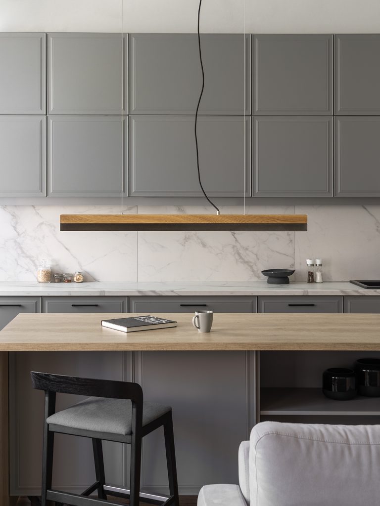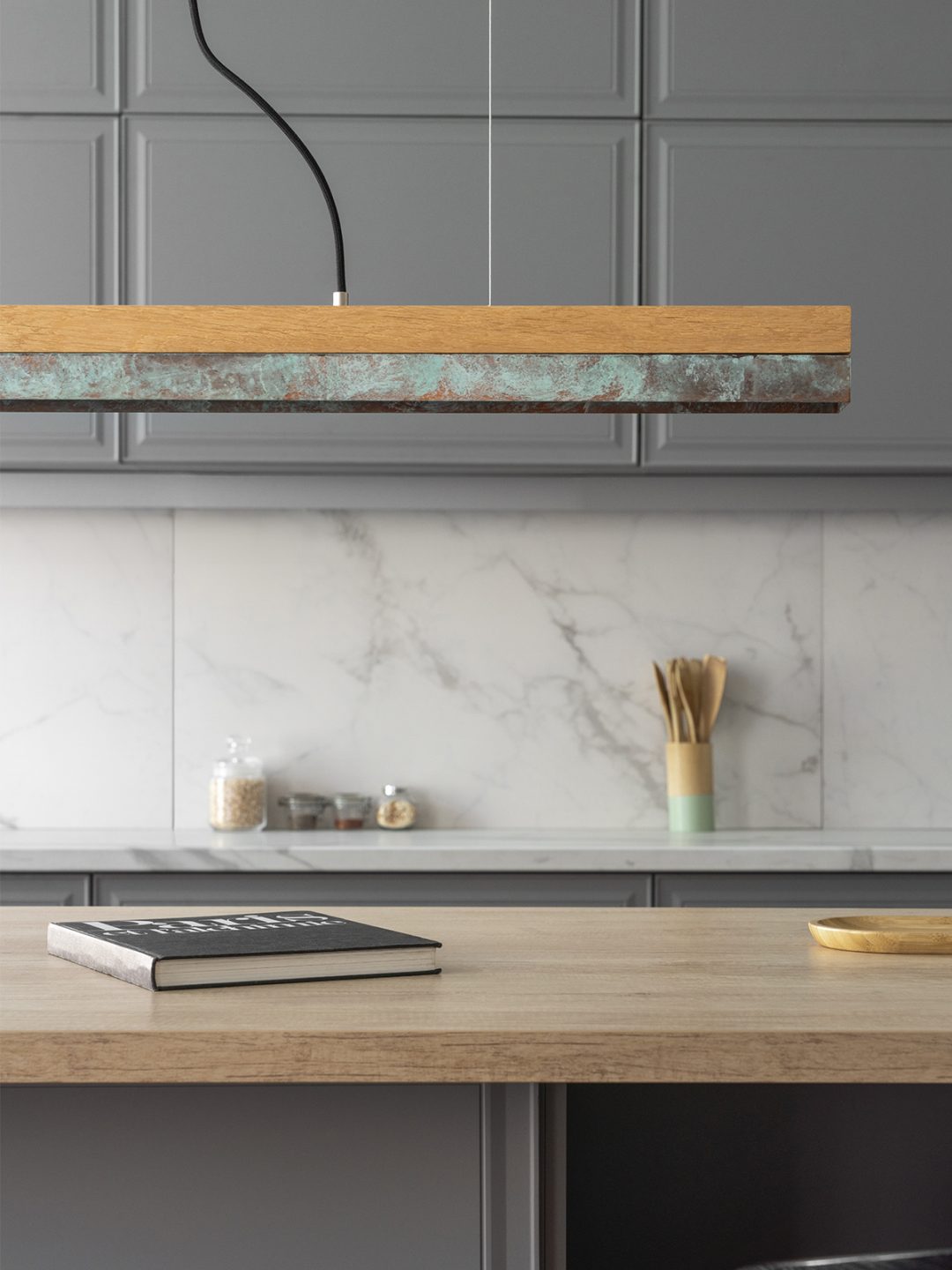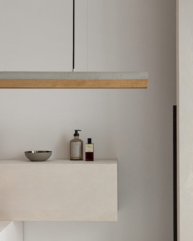 Every light can be configured to individual requirements — length, material combination, surface finish, light colour and cable tone. Whether suspended above a kitchen island, a conference table or the bar of a boutique hotel, the design adapts seamlessly to its architectural environment.