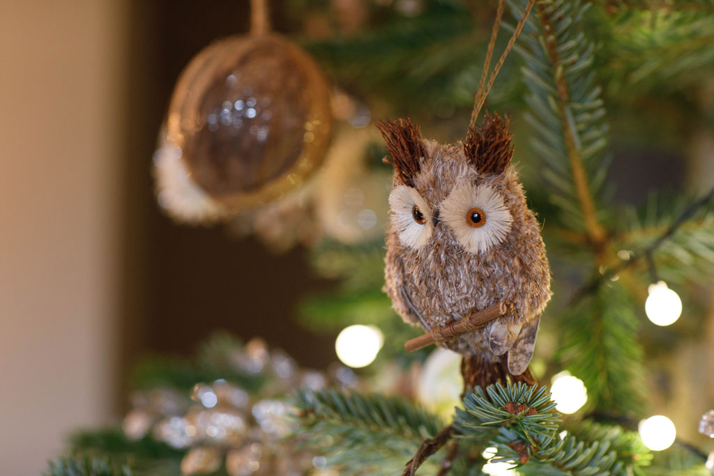 We supplement tinsel for delicate feather boas on our tree to typify layers of soft white snow on the branches. Our stag emerges from the tree as if in the wild, and creates a wonderful point of visual interest for the display. And of course, lots (and lots) of lights, we have small round lights much like little berries to add the sparkle.