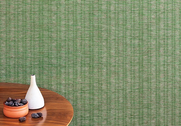 The new wallcovering design, Seagrass, is a translation of a Bruce Goold basket weave design, inspired by a large woven basket that Goold owned. The design is screen-printed using water based pigments inks that have been custom coloured to coordinate with an upholstery collection Goold has created for Woven Image. The print area depicts the negative or shadow space in the design. The flecked flax composition of the base shows through the unprinted areas, creating depth and giving the effect of real woven rattan. Seagrass is available in four colours: Emerald, Watermelon, Soft Grey and Black.